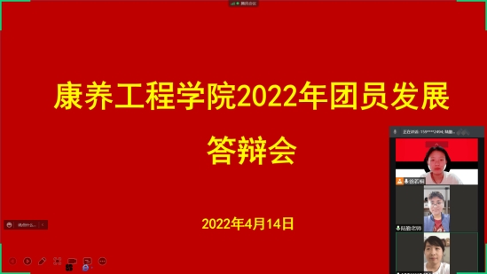 为进一步规范团员发展流程,深入推进全面从严治团,4月14日,康养工程学院团总支召开2022年团员发展对象答辩会。答辩会由学院团总支书记叶俏瑜老师主持,学院党总支副书记陆勤、辅导员、班主任参加答辩评审。