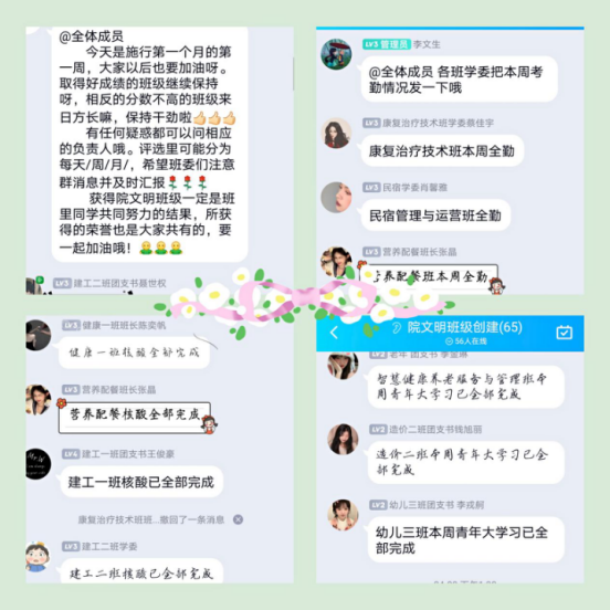 学院21级辅导员邵琪老师表示:自从学院文明班级评选方案试行开始,经常能够看见学生群内同学们之间相互提醒、相互督促。在疫情封闭管理期间,之前经常要催的核酸检测数据上报工作如今每个班总是提前完成,充分调动学生的主体积极性也为我们工作提高了效率。