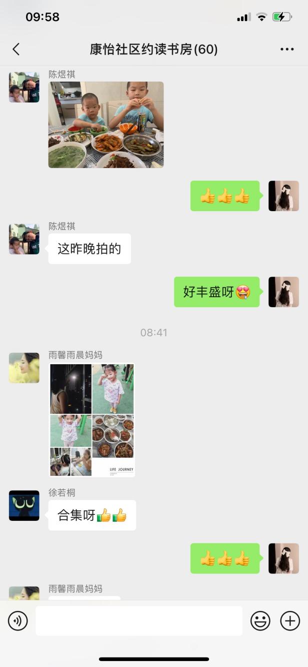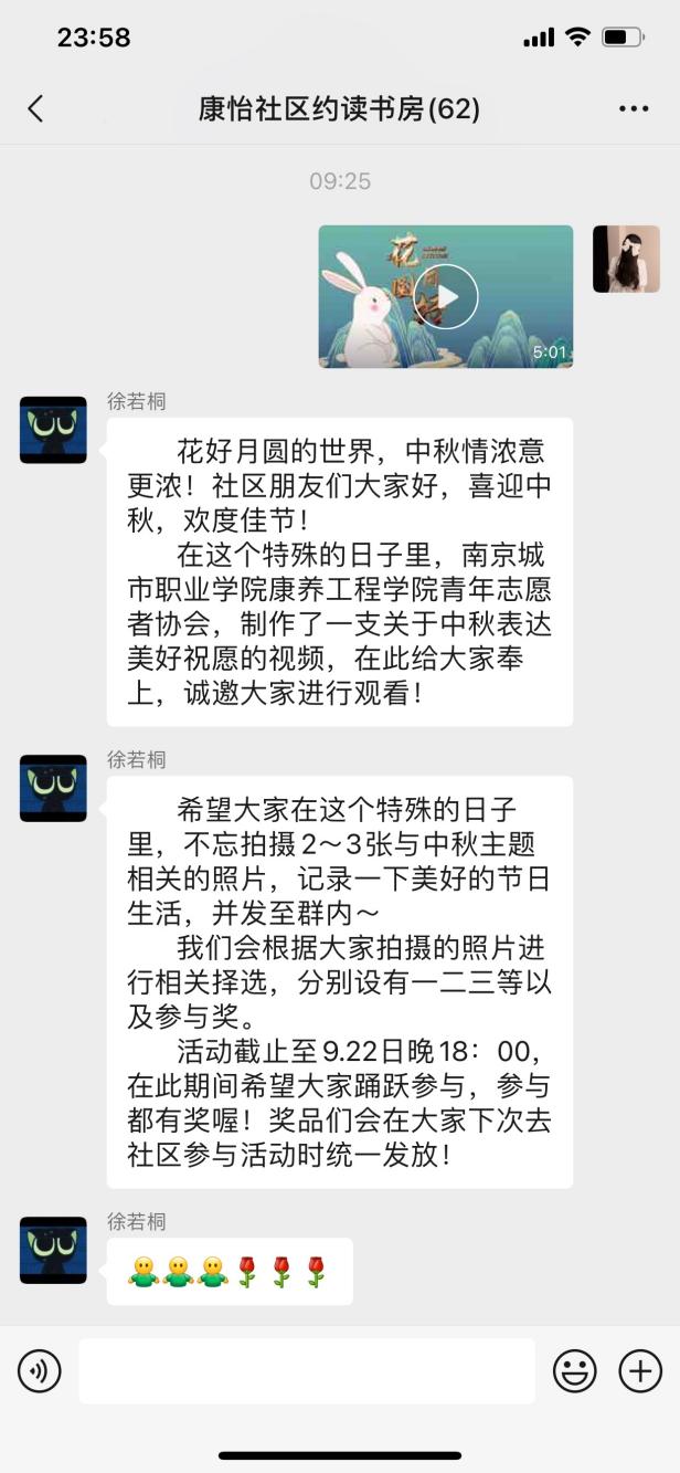 受疫情防控影响,本次活动策划之初,我院青年志愿者们从多方搜集有关中秋节的相关资料并做出整理、拍摄、剪辑,制作成一段内容丰富的分享视频,该视频包含中秋节来历、节日传统习俗、月亮圆缺成因、以及与中秋相关的古诗句等,激发社区居民对中秋节传统文化的浓厚兴趣。视频末尾还有我院青年志愿者们对康怡社区全体居民的节日祝福。此次活动及视频于9月21日上午通过“康怡社区约读书房”微信群发布,一经发出,得到社区居民的积极响应,大家纷纷将合家团圆、共度中秋的精彩瞬间用照片记录下来并分享到群内。