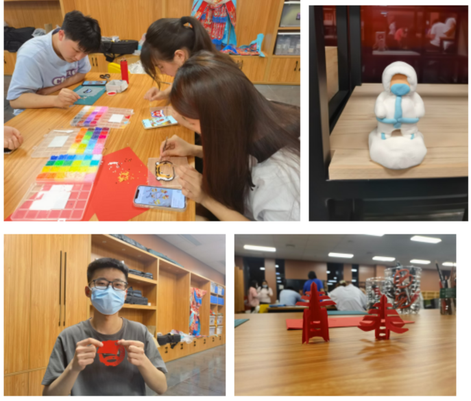 同学们积极参与相关主题活动,现场根据防疫要求有序就座。在指导教师顾涛老师和手工社成员的带领下,同学们发挥自己的想象,以“艺”战“疫”。活动中,大家都非常专注,利用拼豆、手工刻纸、超轻粘土、热缩片等手工材料制作出形式多样的工艺品。制作过程中,一粒粒小小的豆子被一一排列,最后汇聚成一幅美妙的图案;一张张复杂的图纸,被同学们一丝不苟地刻出完美轮廓;一团团平平无奇的粘土,在大家的巧手下也变得有模有样、惟妙惟肖。这一过程无不让同学们感受到匠人匠心,有不少同学的作品都凝聚了自己的想法,充满了创新,制作精美,使人眼前为之一亮。