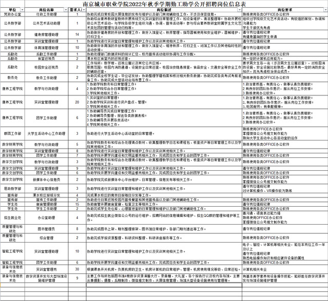 本次招聘的具体岗位、用工人数、岗位要求等详见《我院2022年秋季学期勤工助学固定岗位招聘信息表》(附件1)。
