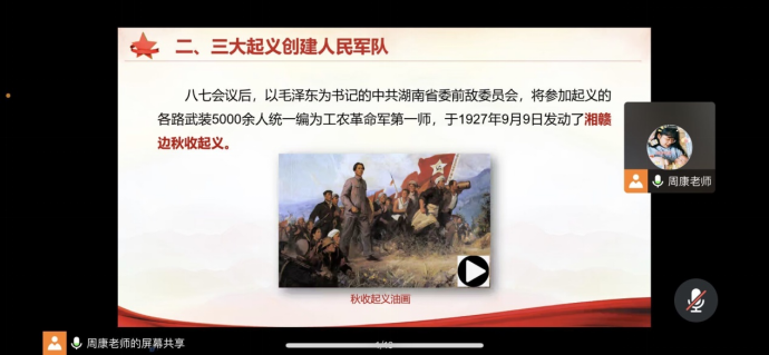 首先,周康老师向同学们从地理位置、开国元勋和亮点三个方面介绍了中国革命的摇篮——井冈山。接下来,周康老师从创建人民军队、星火燎原革命道路、毛泽东思想初步形成、九一八事变、井冈山精神这五个方面深入开展教学。“党史中的一幅画”这一部分内容,周康老师的生动描述引发了大家的思考。周老师播放了一段在毛主席的带领下成功实现农村包围城市夺取全国胜利的革命道路的视频令人不禁心潮起伏、思绪万千。
