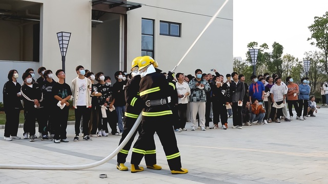 根据消防疏散演练计划表和工作方案,我院师生14:55分到达EF宿舍楼栋下并整队完毕。首先,南京安全教育基地教官对我院师生进行疏散安全教育、程序培训,并对后续演习安全和注意事项做出重点说明。随后,肖一倩副院长宣布演习开始,安全人员检查楼层宿舍及人员准备情况,一场应急疏散演练有序展开。随着警报声响起,同学们用湿毛巾掩住口鼻,按照消防预案的疏散路线,弯腰小步快走,迅速有序下楼,秩序维持的保安及老师们分工明确,各自就位,在安全出口、楼层进行指引及维持疏散秩序,组织学生快速、安全疏散到指定区域。教官指导演习师生正确穿着消防服,进入模拟火场抬出伤员,并演练了心肺复苏方法及AED(心脏除颤仪)的使用。最后,演习工作人员在安全防护下操作灭火水枪模拟灭火,应急演练圆满结束。