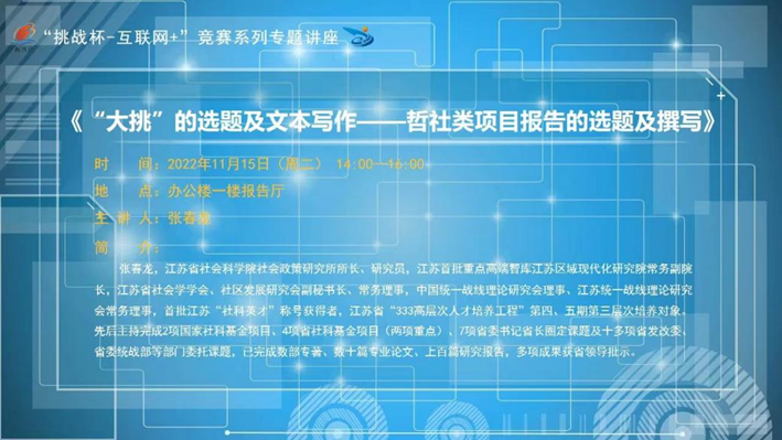 互联网+”竞赛系列专题讲座。11月15日下午,“挑战杯—互联网+”竞赛系列专题讲座第一场在溧水校区办公楼一楼报告厅举办。教务处副处长徐山、校团委书记杜文娟和来自各院部的60余名师生参加了本次讲座。
