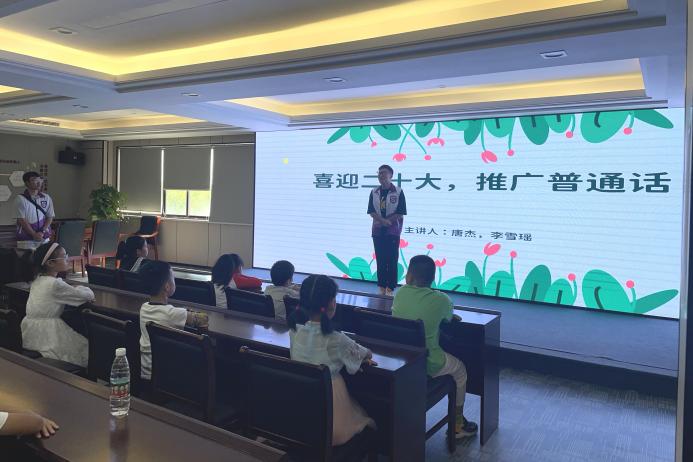 为认真做好第25届全国推广普通话宣传周活动,深入贯彻落实国家语言文字方针政策和法律法规,提升小学生语言文字应用能力,9月17日下午,我校小城志社会实践小分队至溧水开发区团山社区开展“喜迎二十大,推广普通话”活动。