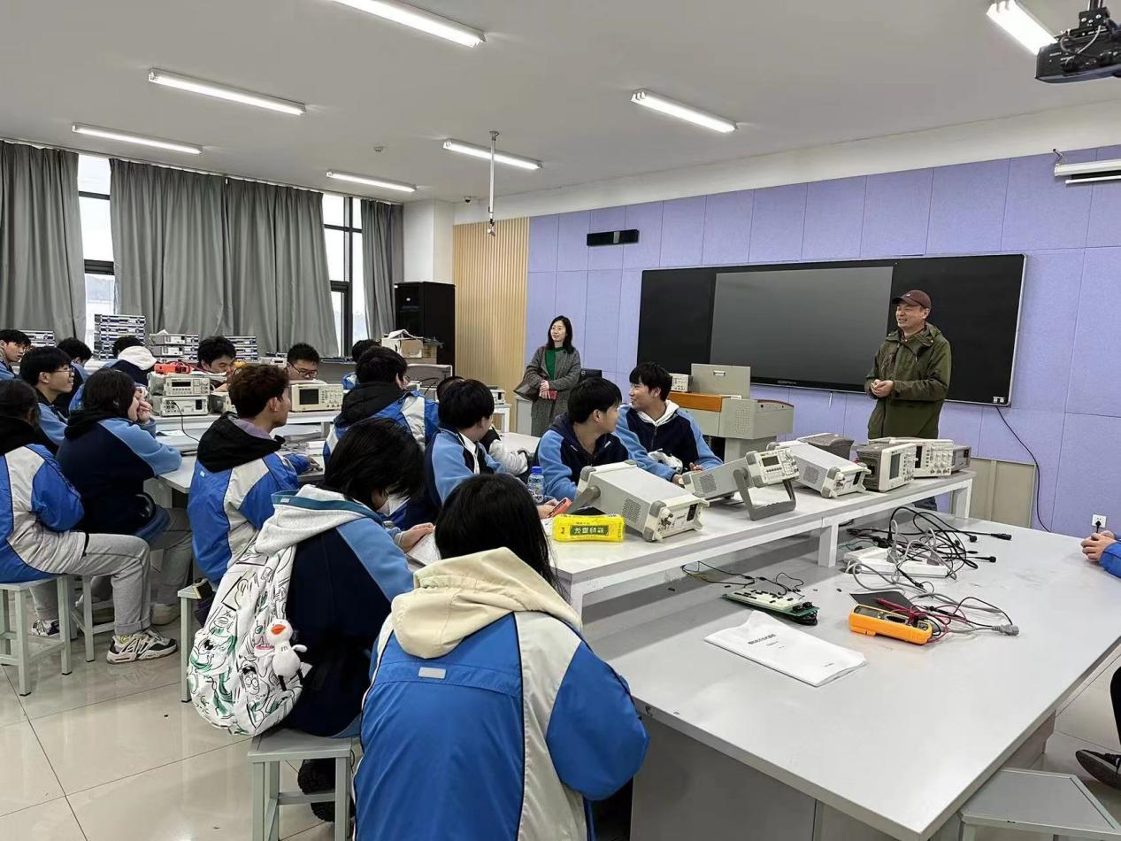 此次来访的是莫愁中专信息工程系教学副主任童音、专业负责人夏平国、班主任黄皓,以及“3+3”项目2021级电子与信息技术30名学生。智能工程学院负责人力志、蔡洁,智能汽车教研室主任张欣、电子专业负责人蔡琦婧、专业老师郭青进行了热情接待。力志对莫愁中专师生来校参观学习表示热烈欢迎,希望同学们将来能顺利转段进入我院就读。蔡琦婧等带领莫愁中专师生参观了教学楼、实训工厂、图书馆、演播大厅、大学生活动中心、学生宿舍、食堂以及体育馆等教学和生活设施,并结合学校实际情况向来访师生详细介绍了我校校园文化建设、学生住宿常规管理、学校教学水平以及未来规划等情况。参观校园结束,在电子专业实训室,已进入我校就读的“3+3”项目的学长学姐们与来访的学弟学妹进行了亲切的互动,气氛十分热烈。双方教师就学生教育发展中的共性问题进行了热烈讨论。