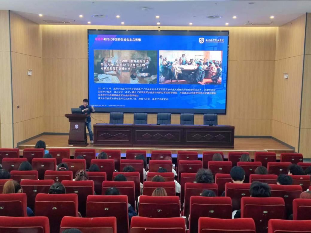 直属第二党总支书记陈卓老师以《学习习近平新时代中国特色社会主义思想 植家国情怀 树远大志向 做优秀青年》为题作专题讲座。陈卓老师以关键词解读的方式,结合中国国情和国际环境,通过大量史实、案例和数据,阐述习近平新时代中国特色社会主义思想创立与不断丰富发展的过程。
