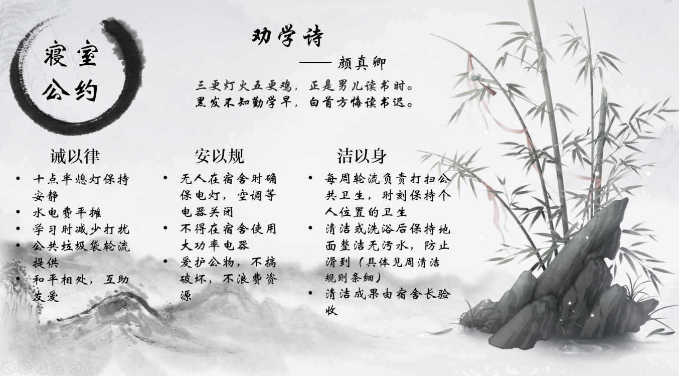 在辅导员们的引导下,同学们热情高涨,积极参与其中,以独特的视角展示自身宿舍风采,同学们自主协商、制定个性化“宿舍公约”,从卫生环境、文明道德、优良学风、安全健康等方面进行规范。比如明确规定,“不吸烟,不乱扔杂物”、“不饲养动物”等,还倡导“文明上网,合理作息”,“自觉履行值日义务”等,为了使公约形象化,同学们还以图画的形式,制定宣传画张贴。