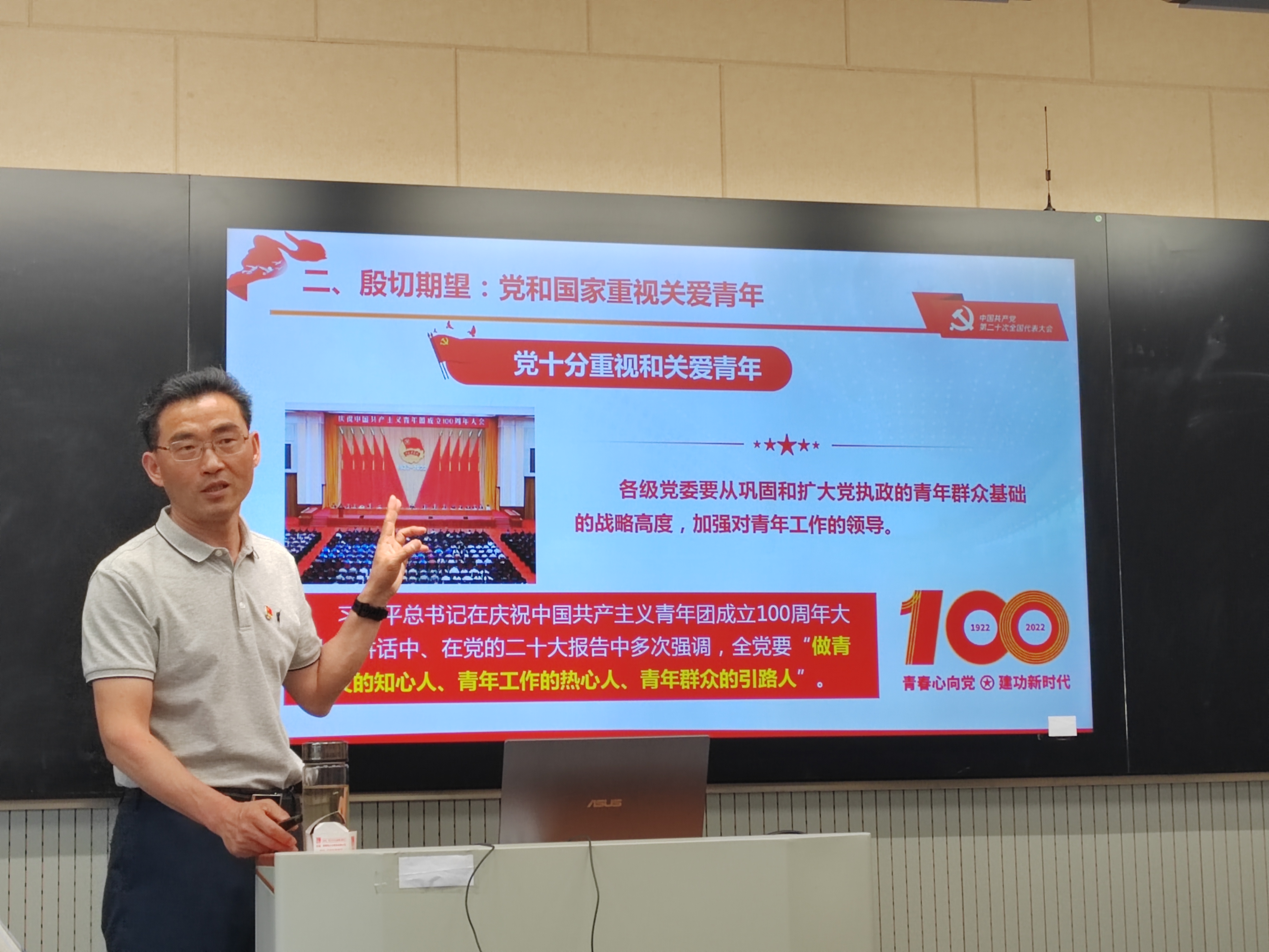 史献平副书记带领大家重温中国共产党第二十次全国代表大会主题和动员令的基础上指出,我们党是十分重视和关爱青年群体的,希望青年要有理想、有担当、有道德、有本领。作为教育工作者我们要牢记习近平总书记的嘱托,把青年工作作为战略性工作来抓,要在坚定理想信念上下功夫,在厚植爱国主义情怀上下功夫,在加强品德修养上下功夫,在增长知识见识上下功夫,在培养奋斗精神上下功夫,在增强综合素质上下功夫,真正做到立德树人,关心和帮助青年学生健康成长,要努力做到以下四点:一是要引导学生有理想,正能量,自信自强;二是要引导学生敢担当,善作为,笃学笃行;三是引导学生能吃苦,愿奉献,克己为人;四是引导学生肯奋斗,勇拼搏,走在前列。