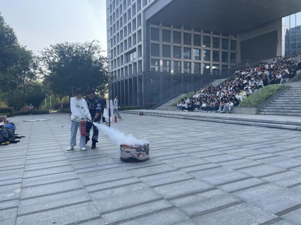 为确保学生在演练过程中的安全,在演练正式开始之前,教官对学生进行了约半小时的安全培训。培训分为两个部分,第一部分是消防安全知识的传授,使学生充分认识消防安全的重要性,消防常识,火场逃生本领等;第二部分是消防安全实训的示范,教官向学生演示了灭火器、灭火毯的正确使用方法等,并邀请现场学生亲身参与体验。