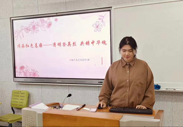 为纪念英烈,传承红色基因,让同学们更深入地了解中国革命的历史,增强对红色基因的认同和理解,了解和传承革命先辈的崇高精神和奋斗历程,数字文创学院2022级产品艺术设计1班团支部于4月17日在敬业楼316教室举办“清明祭英烈 共铸中华魂”主题团日活动,班级全体同学参加,班级团支部书记朱映臻同学主持活动。