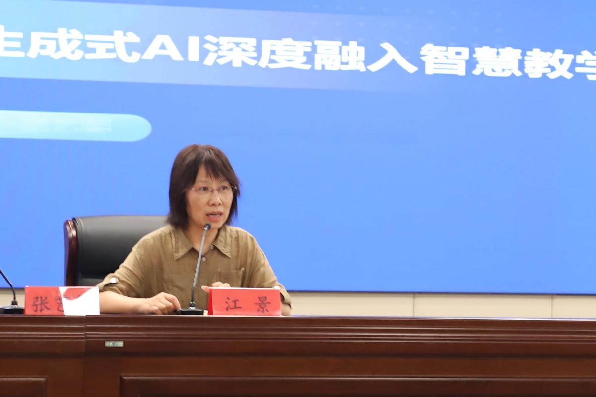 江景副校长做动员致辞。她从三方面展开阐述,即教师为什么要学、学什么以及怎么用。她强调,人工智能是当下职业教育变革的核心驱动力,与职业教育的“五金建设”紧密相连、相辅相成。通过提升AI运用能力,赋能教改、课改以及科研工作,助力教师更加高效地开展工作,从而使我校育人成果更贴近产业需求。