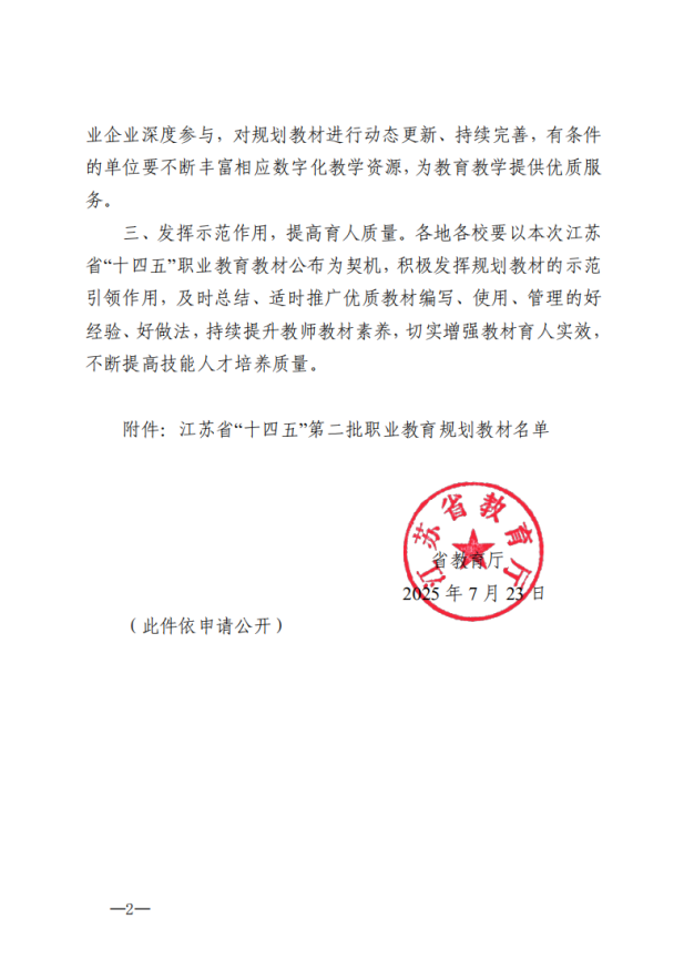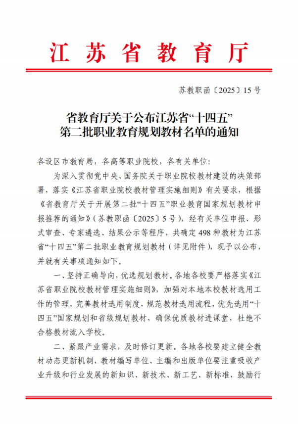 近日,江苏省教育厅下发《省教育厅关于公布江苏省“十四五”第二批职业教育规划教材名单的通知》(苏教职函〔2025〕15号),我校《数字技术与数据可视化》《BIM应用基础教程》《老年人康复保健技术》3部高职教材成功入选。