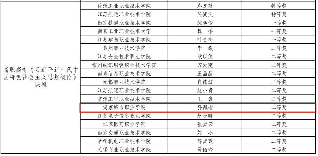近日,江苏省教育厅公布了第三届全省高校思政课教学展示活动获奖名单,我校马克思主义学院孙佩瑜老师凭借出色的表现,荣获高职高专《习近平新时代中国特色社会主义思想概论》课程组二等奖,为学校赢得了荣誉。