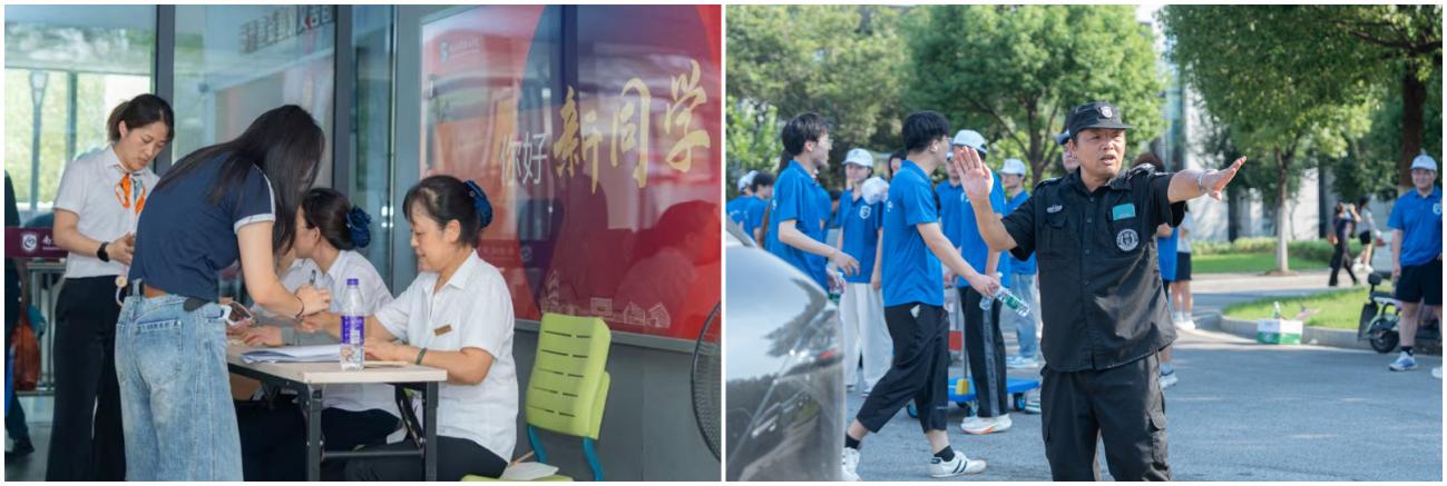 二级学院报到点的工作人员耐心细致地为新生办理报到手续;装备与信息化建设处师生团队高效开展人像采集工作;宿管阿姨用慈爱与细心维护宿舍秩序,协助新生入住;技术、物业、安保、食堂等岗位人员则坚守职责,在系统维护、交通疏导、餐饮保障、校园巡查等工作中默默奉献,共同为迎新工作保驾护航。学校还为家庭经济困难新生开通“绿色通道”、发放爱心礼包,为报到期间过生日的新生准备蛋糕,传递“我院大家庭”温暖。