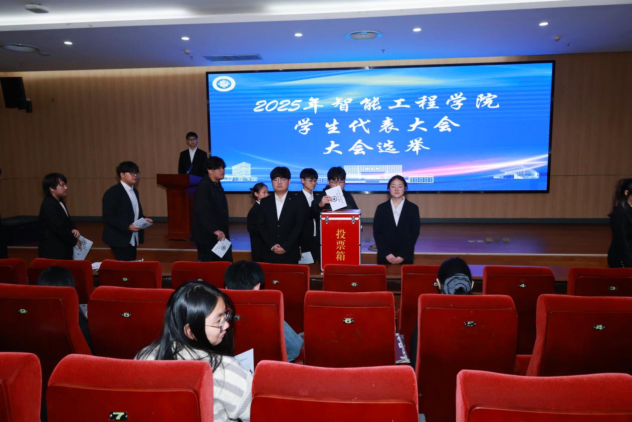 在选举环节,与会代表本着高度负责的态度,郑重投下选票,依法依规选举产生了智能工程学院2025届学生会主席团成员,以及出席我院第十次学生代表大会的代表。整个选举过程组织严密、程序规范、透明高效,充分展现了学院学生工作的民主性与先进性。