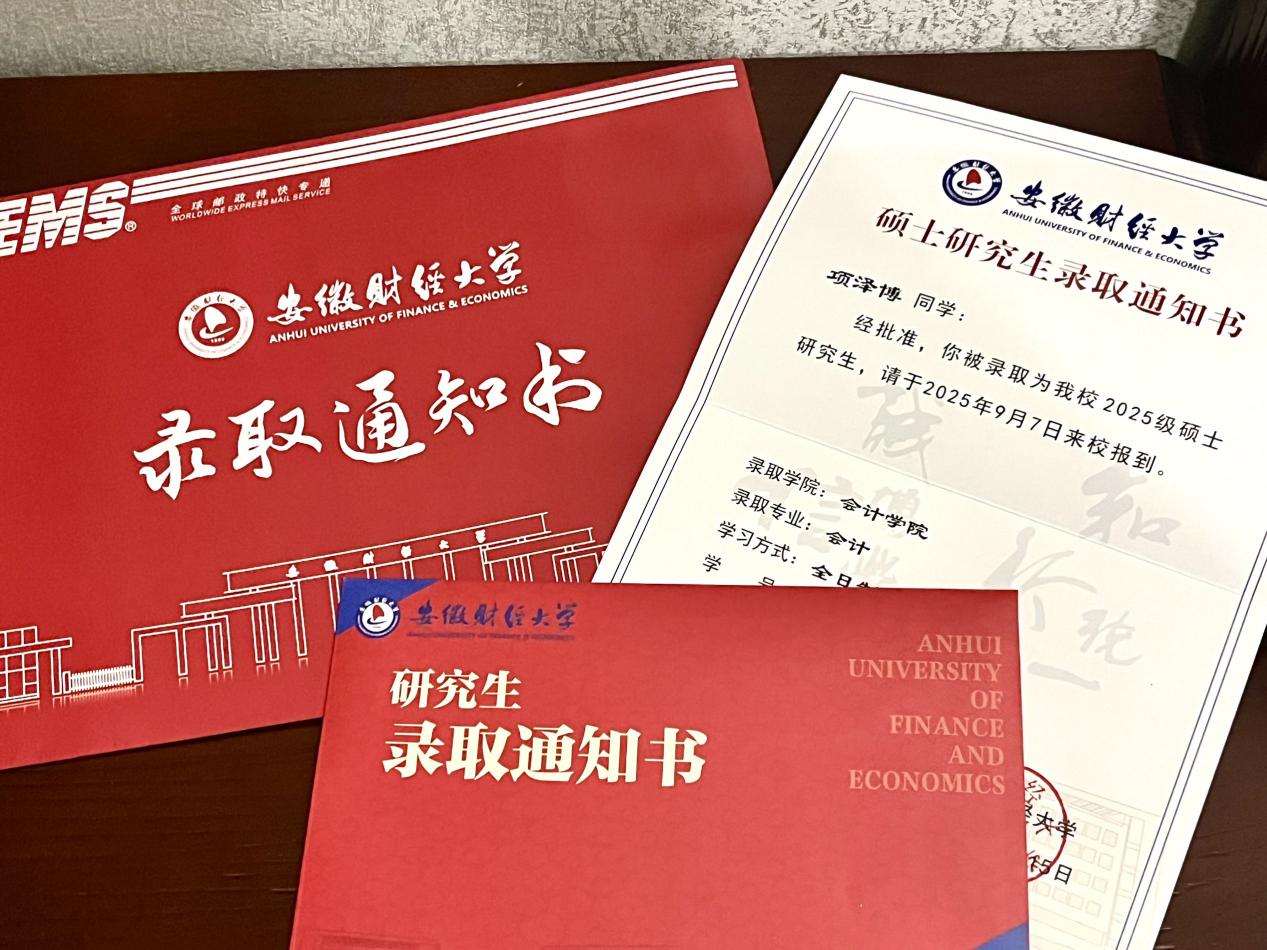 近日,数字财商学院2023届大数据与财务管理专业毕业生项泽博同学传来喜讯!历经专转本升入江苏科技大学后,他坚持不懈,最终成功考取安徽财经大学会计专业硕士研究生!