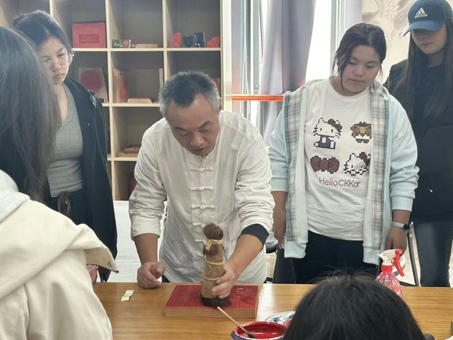 2025年10月28日,数字文创学院举行李江民非遗技艺传承技能大师工作室“传艺工坊”开班仪式。李华俊老师莅临现场,并与同学们亲切交流,向同学们展示了自己的雕版印刷作品。李老师通过介绍这些作品的创作灵感和制作技巧,激发了学生浓厚的兴趣。