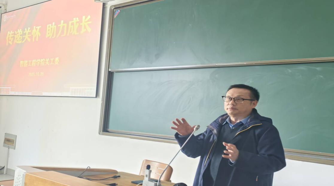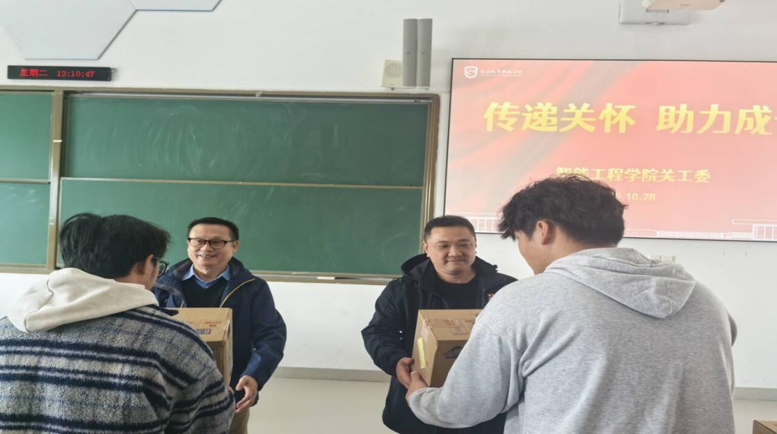 2025年10月28日中午,智能工程学院关心下一代工作委员会在勤学楼309教室举行“传递关怀助力成长”主题慰问活动。学院党总支副书记、副院长韩峻,关工委副主任赵振涯,2025级新生辅导员及班主任参加,以暖心交流与实际关怀为新生成长保驾护航。