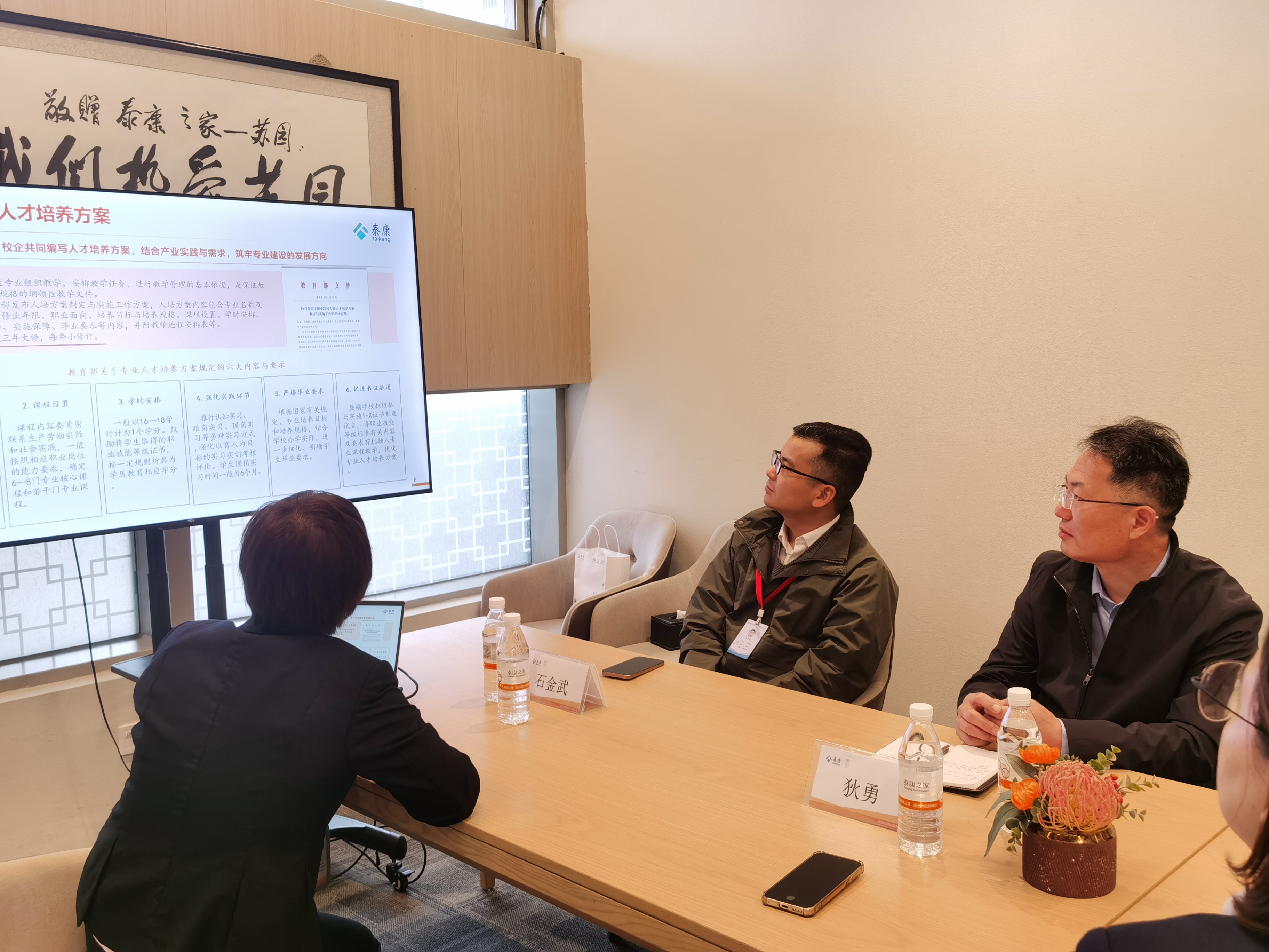 座谈环节,狄勇院长介绍了学校基本情况,以及智慧健康养老服务与管理专业的发展情况与前景;张翠英经理介绍了泰康之家、泰康之家苏园校企合作、人才需求等情况。双方就校企合作的内容、方式,建立“泰康班”等进行了探讨和交流。双方表示,以养老服务人才培养为契机,共同开展好校企合作,以需求为导向,做实协同育人机制。