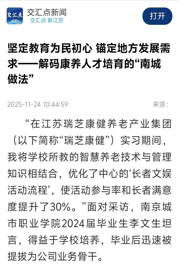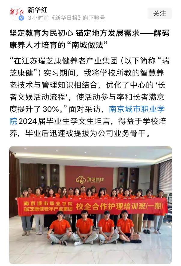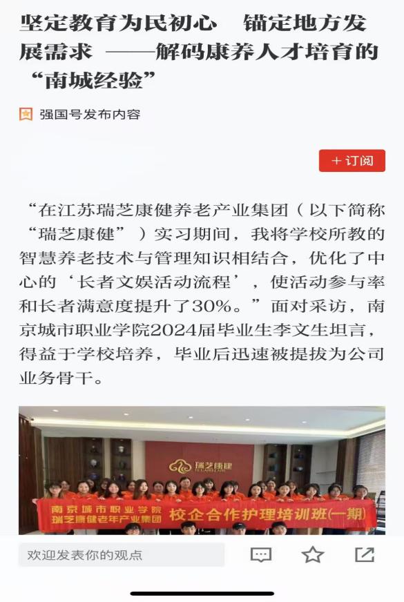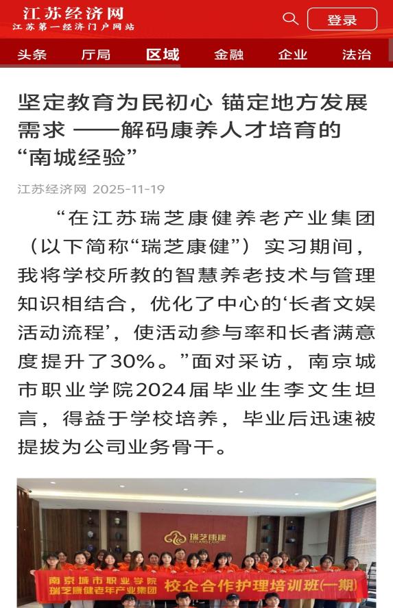 我省主流媒体对学校康养人才培育经验的聚焦,既是对“校地融生、产教融合”路径的肯定,更是对新时代职业教育高质量发展的鞭策。学校将持续深化教育为民初心,为服务南京“4266”现代产业体系与溧水区健康产业集聚区建设注入新动能。