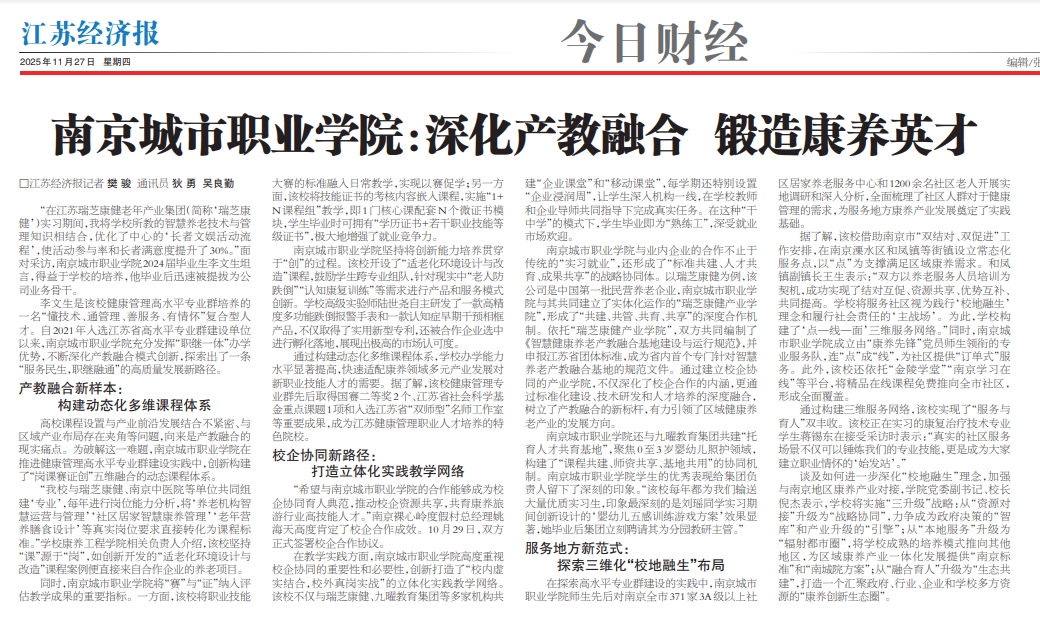 近日,我省主流媒体《新华日报》《江苏经济报》和“交汇点新闻”“学习强国”等平台刊发《坚定教育为民初心 锚定地方发展需求——解码康养人才培育的“我院经验”》专题报道,深度解析我校康养工程学院在服务区域发展、创新人才培养模式上的实践成果。报道从产教融合、校企协同、服务地方三个维度,系统梳理了学校紧扣“健康中国”战略、加快构建康养人才培育高地的特色路径,引发社会广泛关注。